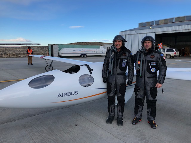 On August 17, 2018 Perlan 2 made it’s second tow into the stratosphere. We awoke to pounding rain from 4:30-5 am followed by snow flurries. But after that frontal passage the skies cleared as Dan Gudgel had forecast. Linda took the photo of the day at sunrise. On this flight (only #48) Jim and Miguel Iturmendi towed behind Arne in the Egrett to just over 44,000 feet (Flight Level 440). We did not expect wave. But each pilot needs to be experienced with the challenges of stratospheric flight. This is the highest documented tow ever of a glider and it was another “rocket ride.” They were at 40,000 feet in 45 minutes from takeoff. So almost 1,000 feet per minute on average behind the powerful Egrett. Jim said: