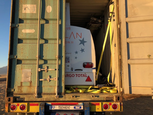 On November 2 after 12,700 miles over 45 days of travel the Perlan 2 arrived back home in Minden, Nevada. Each journey is unique in its logistical challenges. Sometimes the obstacles are paperwork, or insurance, or connections, or a blizzard closing Andes mountain roads, or a port slow-down, or a winter storm closing a port. We’ve overcome all of these situations before. This trip had its share with a hurricane near Mexico which impacted our shipping schedule. But when our container arrived as the sun crested the Minden mountains, Jim quickly determined that all looked ok inside the container at first opening.